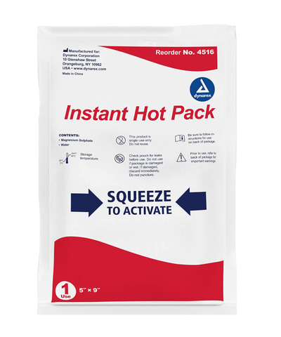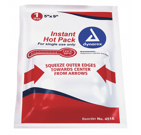 Dynarex® Disposable Hot Packs are made of an environmentally friendly epsom salt based formula that is non-toxic, latex free, and does not require any special packaging requirements for shipping. The hot packs are easily activated with one hand and will not harm the patient or the environment if damaged. Hot packs can reach 140 degrees. Size - 5" x 9"