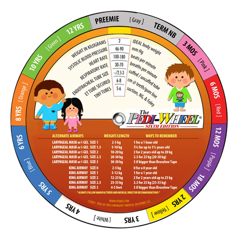 The Pedi-Wheel® by EMS Advantage is a convenient pocket reference tool that puts vital pediatric data at your fingertips. This sturdy, full-color, water resistant device provides critical information that could be useful during a pediatric emergency. Volumes of vital pediatric information have been compiled into this slide chart that is only the size of a compact disc.