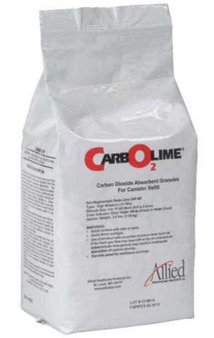Allied Healthcare Products Carbolime Carbon Dioxide Absorbent is a granular soda lime based compound intended for the efficient removal of carbon dioxide from closed and semi-closed patient breathing circuits without the use of potassium hydroxide (KOH).